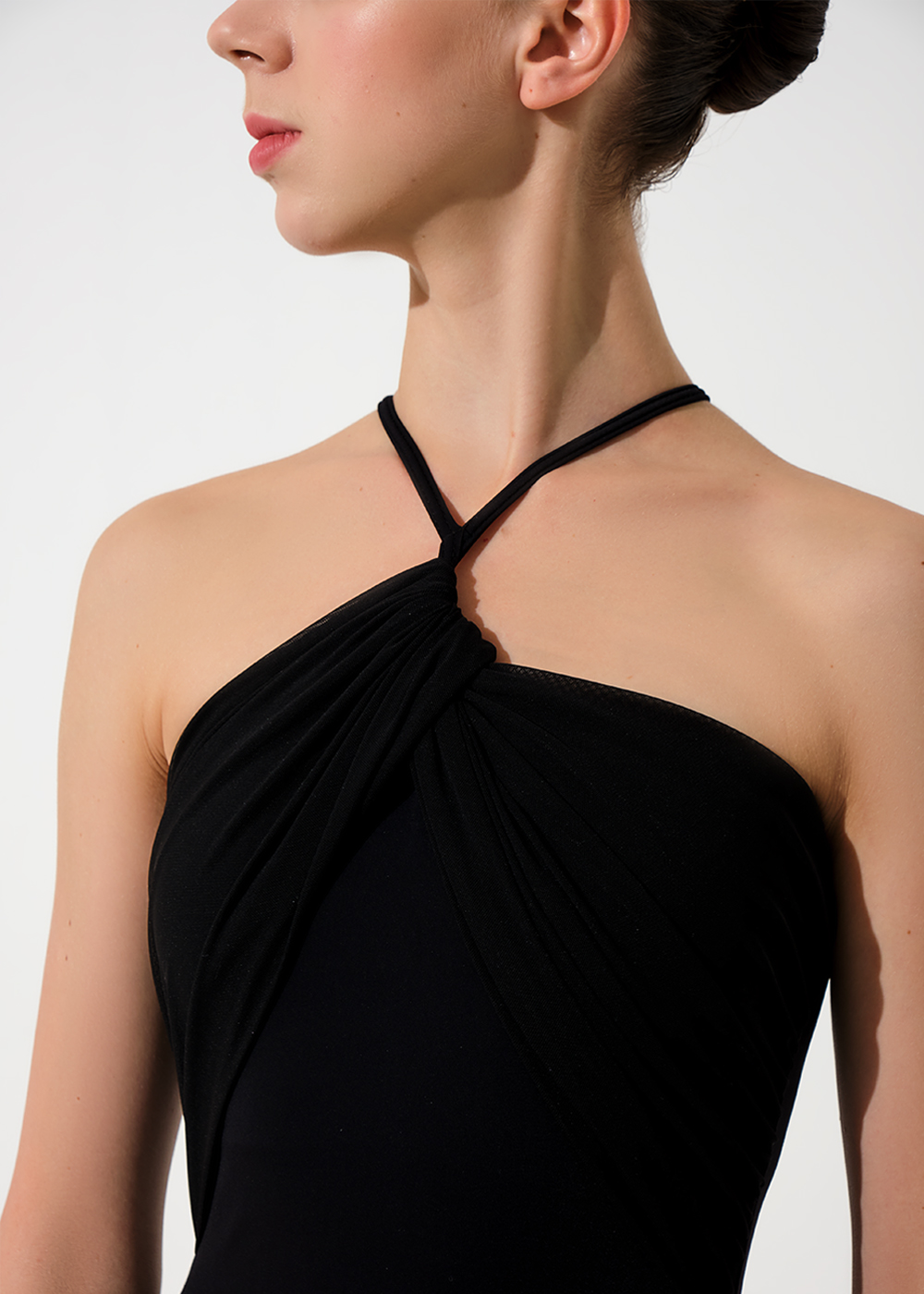 - Adult Hand gathered detail on bust, faux halter leotard with adjustable straps. Absolutely stunning leotard with gorgeous lines and inspiring quality.